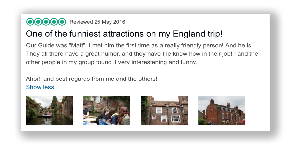 This one started so strong. Matt’s great! He’s really friendly! And funny, he’s funny too. And so good at his job. Not only that but the other people on the trip enjoyed it too. This is marvellous stuff. We were all set to give Matt a rise until we looked at the pics provided by the reviewer and realised that they’d been to Canterbury, not Cambridge, and we definitely don’t work in Canterbury. It’s gorgeous though – maybe we should set up there?